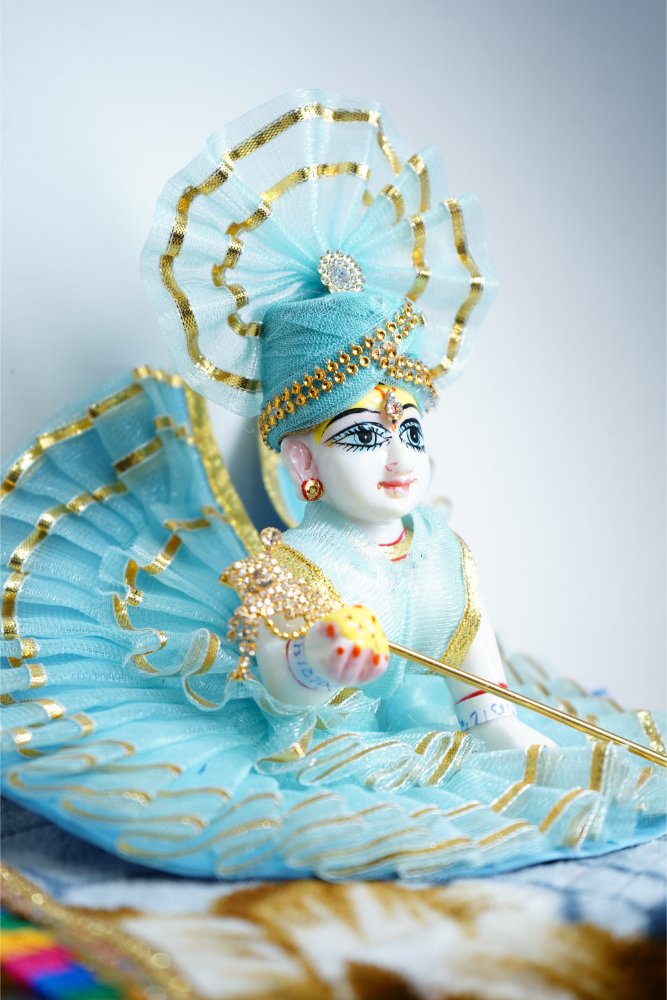 This beautifully handcrafted dress features soft sky blue fabric decorated with elegant golden lace borders that give a royal and devotional look to your Kanha Ji. The poshak includes a matching mukut and layered frill design that adds charm and elegance to your Laddu Gopal idol.