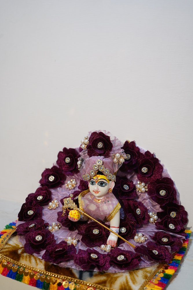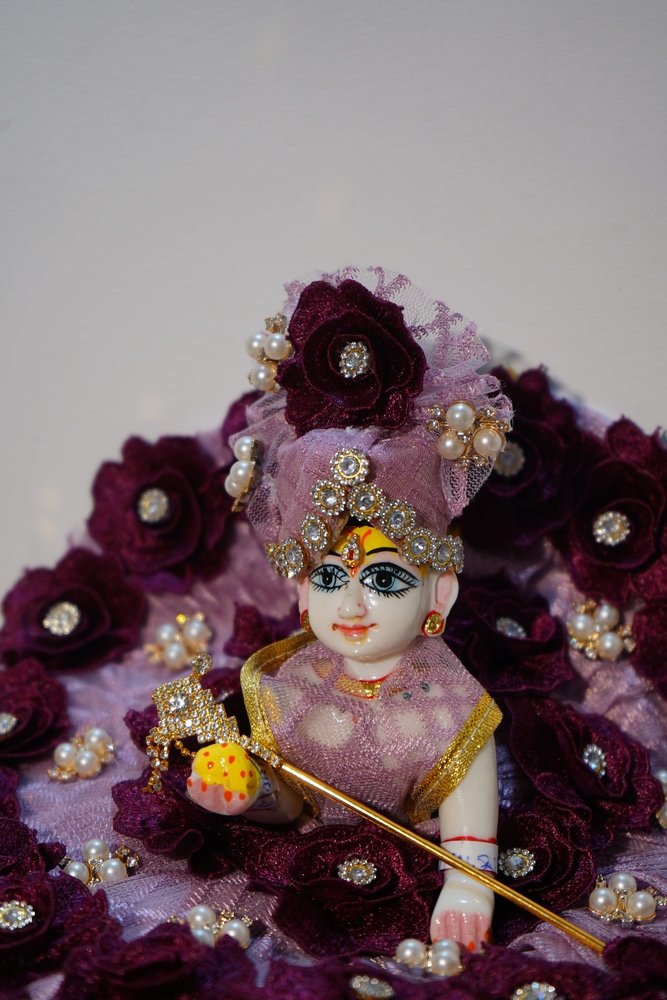 Beautiful wine purple floral Laddu Gopal poshak designed with decorative velvet flowers, pearl embellishments, and a stylish mukut. This premium dress gives a royal and elegant look to Laddu Gopal and is perfect for Janmashtami, temple decoration, and daily seva.